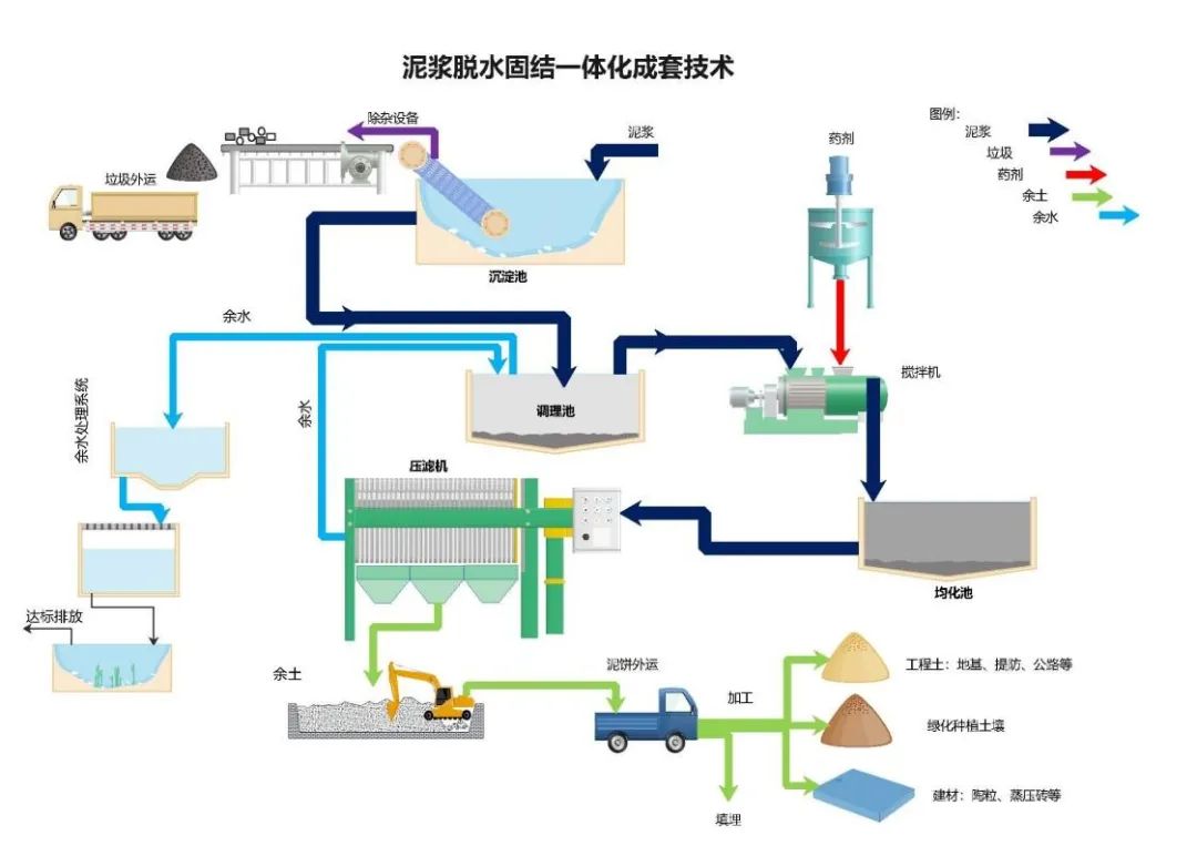 一是乐鱼(中国)环境淤泥固化处理中心采用创新淤泥脱水固结一体化处理技术体系。河道、暗涵、管网所清淤泥,经全封闭运输送往项目底泥处理厂,经除杂、除渣、调节、加药均化后进行板框脱水,脱水固结成可再生使用泥饼,泥饼含水量可降至40%以下,实现淤泥无害化处理。