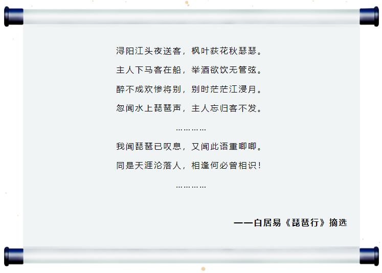故事是这样的:某个秋夜,白居易在浔阳江上送别友人,听到江舟之上有人弹琵琶,且琵琶声带着京师长安的韵味。好奇之下,白居易请来琵琶女,经过攀谈了解到她从京城流落至此的悲惨经历,便不由自主带入了自己相同的身世,一时之间,惆怅逆流成河,便写下一首七言诗行——《琵琶行》。