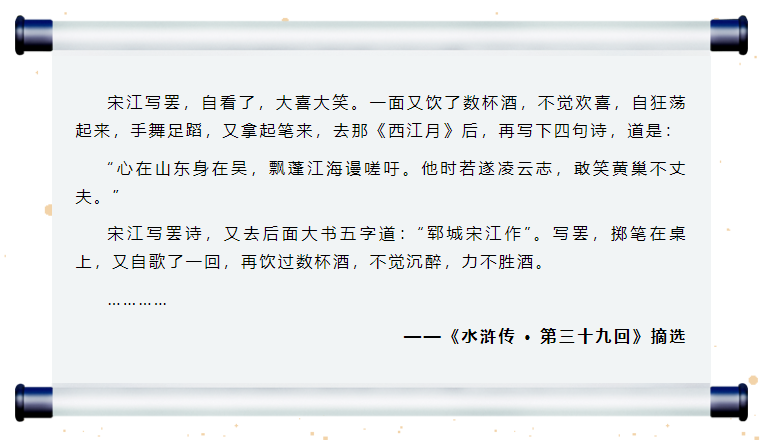 于是,在酒劲儿怂恿之下,宋江提笔挥毫,在浔阳楼上写了一首诗:“心在山东身在吴,飘蓬江海谩嗟吁。他时若遂凌云志,敢笑黄巢不丈夫!”临了,还不忘署上自己的大名——郓城宋江。