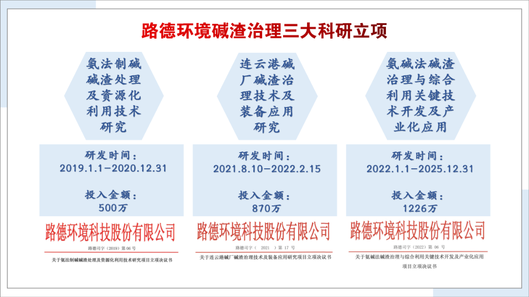 在此期间,公司为满足连云港城市建设和碱渣治理的需要,进行了以“脱水固结一体化技术”优化碱渣治理工艺、碱渣场处理利用技术研究、制定碱渣治理地方标准、碱渣处理与利用项目实施方案等诸多方面的尝试,并先后启动《氨法制碱碱渣处理及资源化利用技术研究》《连云港碱厂碱渣治理技术及装备应用研究》《氨碱法碱渣治理与综合利用关键技术开发及产业化应用》三项科研项目,持续深化碱渣治理技术迭代和产业应用新路径。