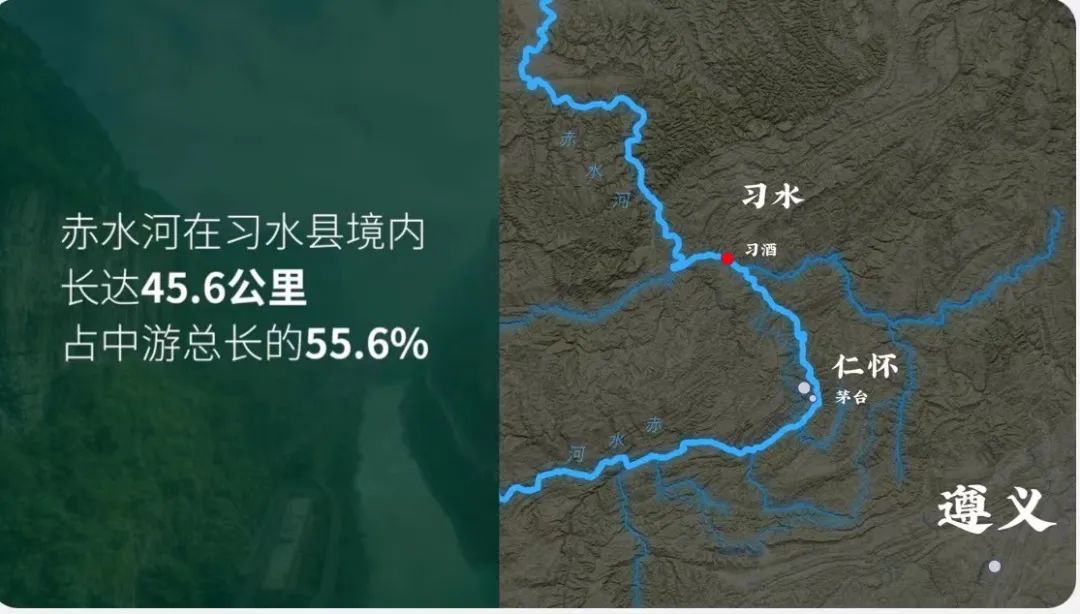 在习水县境内,赤水河长达45.6公里,占中游总长的55.6%,地处赤水河流域优质酱酒核心腹地的区位优势,为习水产区的强势崛起打下了坚实的基础。