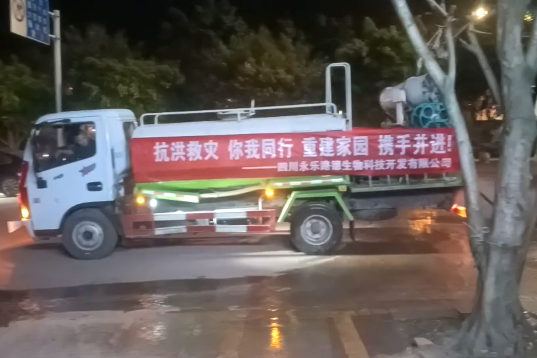 公司组织洒水车进行道路清理助力城市灾后恢复