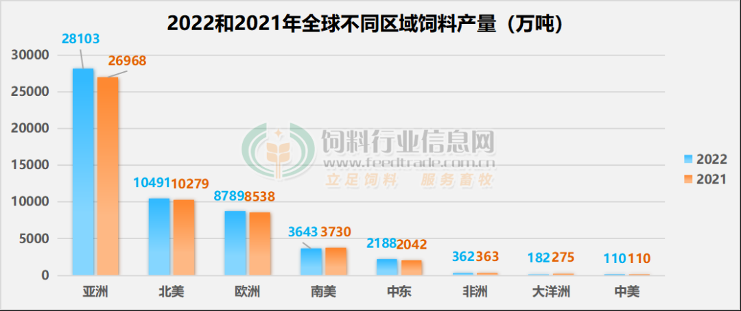 首先,从地区来看,仍然是亚洲和北美洲饲料产量过亿吨,但是中东地区同比增幅最多,达7.15%,而大洋洲同比降幅最大,超过33%。