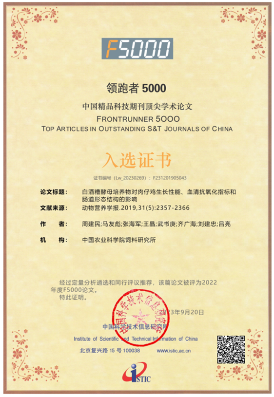 公司与中国农业科学院饲料研究所家禽营养与饲料创新团队共同完成并发表于《动物营养学报》(2019,31(5): 2357-2366)的学术论文—《白酒糟酵母培养物对肉仔鸡生长性能、血清抗氧化指标和肠道形态结构的影响》,入选2022年度“领跑者5000—中国精品科技期刊顶尖学术论文(F5000)”和学术精要(2023年5-6月)高PCSI论文、高被引论文和高下载论文。