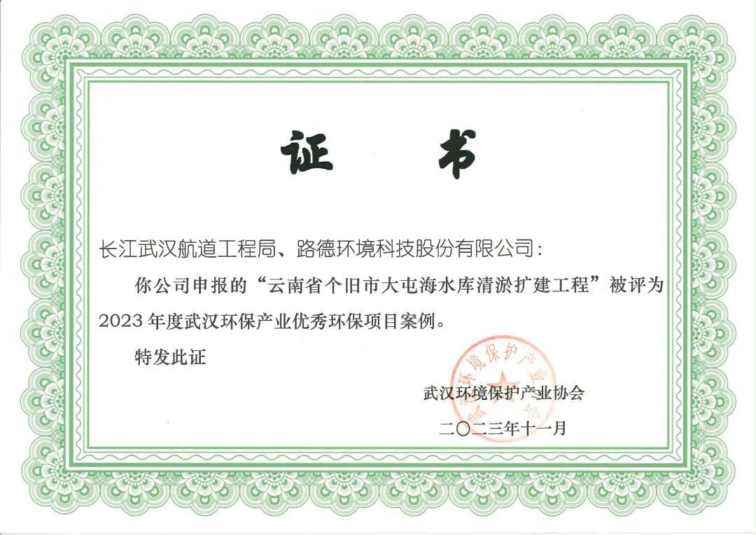 公司“云南省个旧市大屯海水库清淤扩建工程”被武汉环境保护产业协会评选为“2023年度武汉环保产业优秀环保项目案例”。