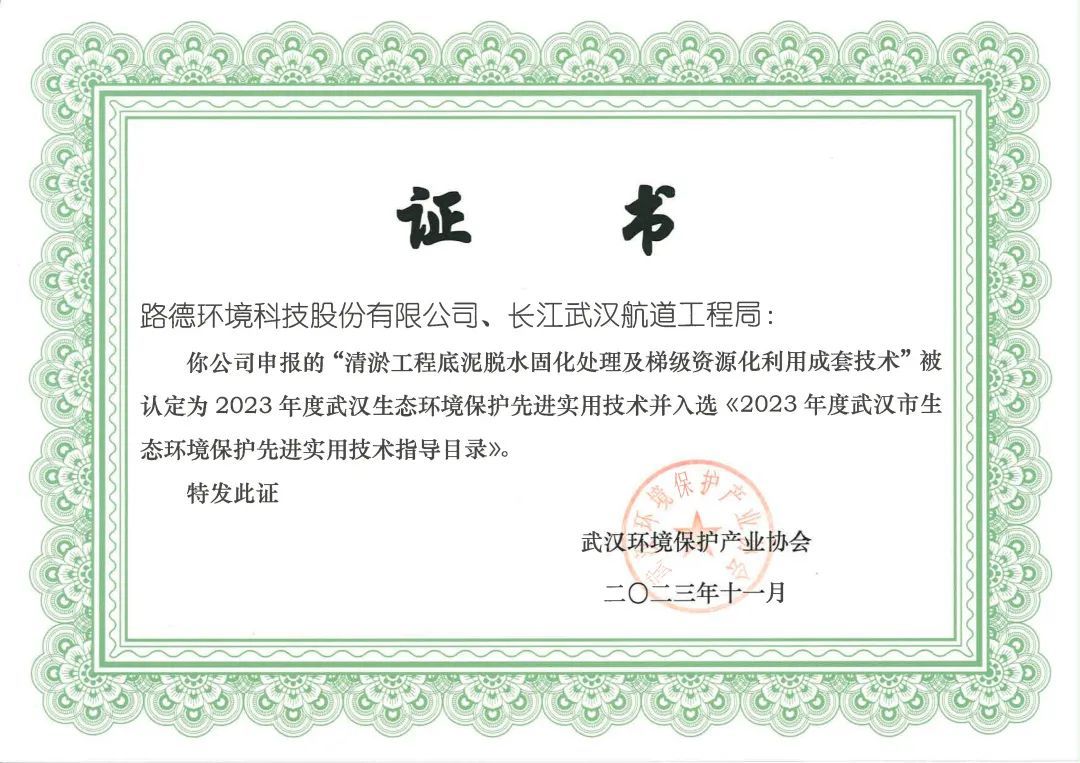 公司“清淤工程底泥脱水固化处理及梯级资源化利用成套技术”被武汉环境保护产业协会认定为“2023年度武汉生态环境保护先进实用技术”并入选《2023年度武汉市生态环境保护先进实用技术指导目录》。