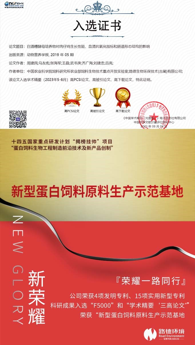 公司荣获19项技术专利(4项发明专利、15项实用新型专利);合成生物科研项目入选湖北省科技厅2023年省科技计划立项项目;产品应用科研成果入选“F5000”和“学术精要‘三高论文’”;公司荣获“新型蛋白饲料原料生产示范基地”称号;河湖淤泥处理项目获评“2023年度武汉环保产业优秀环保项目案例”;获评“中核集团合格供应商”。