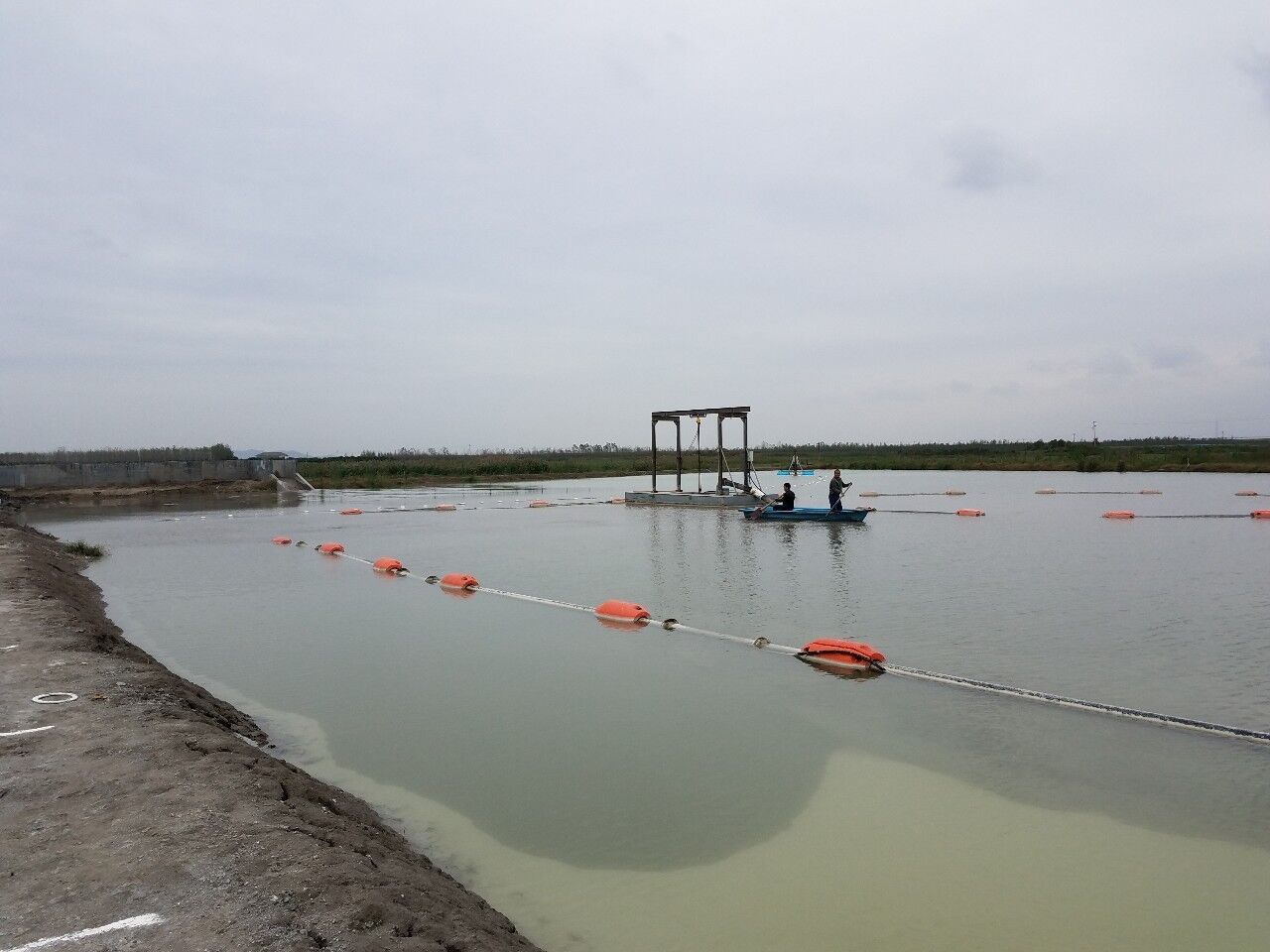 记者在现场看到,两艘淤泥运输船满载着散发恶臭的淤泥停靠在岸边,七八位工作人员拿着水枪往淤泥上冲水,同时多根水管深入淤泥下,将被水稀释过的泥浆吸入处理中心内一个有足球场大小的沉淀池内。