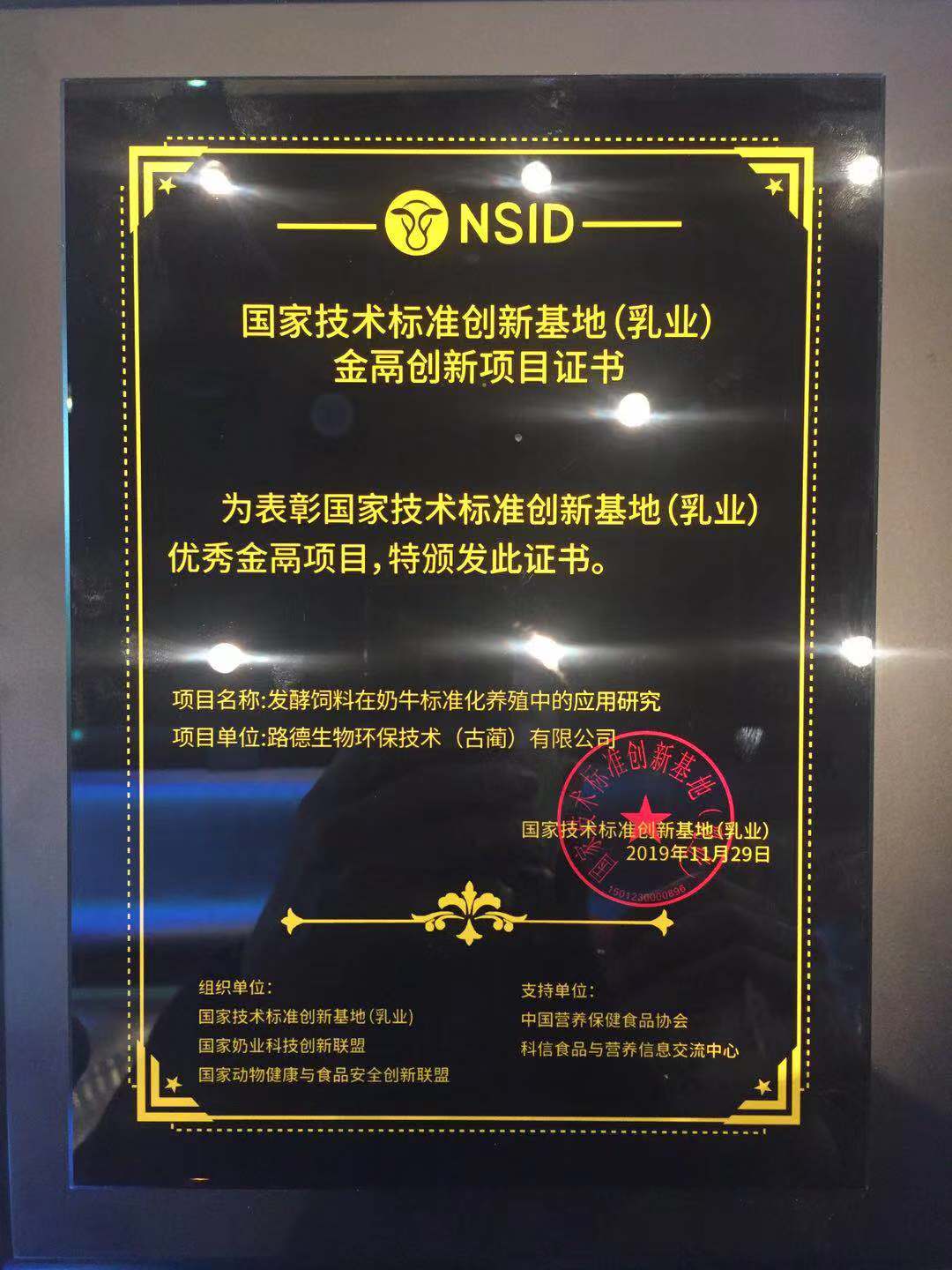 热烈祝贺乐鱼(中国)生物环保技术(古蔺)有限公司创新项目“发酵饲料在奶牛标准化养殖中的应用研究”荣获国家技术标准创新基地(乳业)金鬲创新项目证书。